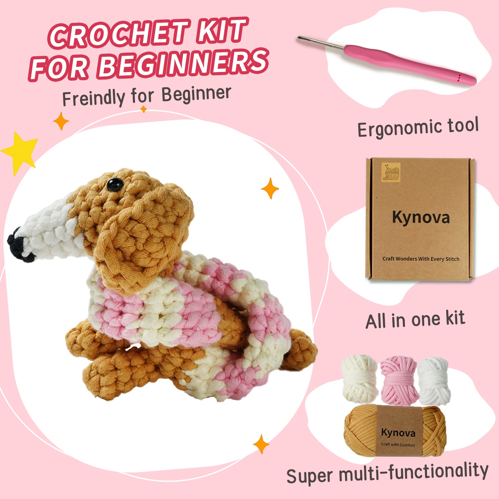Bring home the charm of a long-neck dachshund with Kynova’s Crochet Kit! This all-in-one kit includes everything you need to create an adorable, customizable dachshund that’s perfect for fashion and fun. Whether you’re a beginner or an experienced crafter, this kit is designed to inspire creativity and joy.